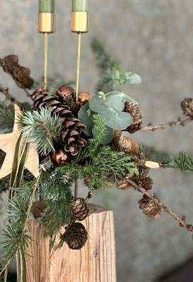 Mit einem -Holzscheit – 2 Stab- o. Spitzkerzen und besonderem Grün & Zweigen u.a. Wacholder und Lärche,