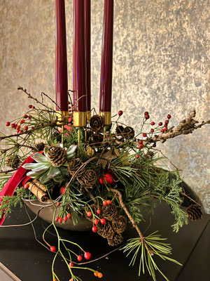 haben wir uns ein filigranes, leichtes Adventsgesteck für euch überlegt. Schöne Zweige, Naturfrüchte/Zapfen und