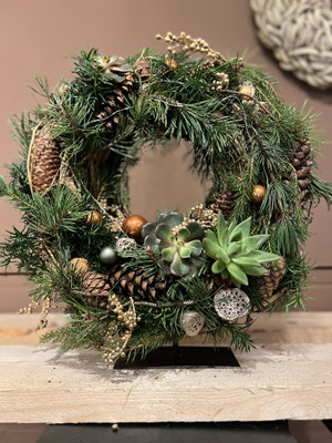 Objektbeispiel der "Stehende Kranz auf einem Gestell"- die waldige Variante - auch in grau/grün, zB. Skandinavisch möglich -Farbliche Gestaltung ganz individuell. Durchmesser ca. 45 cm. ©Floralwerkstatt