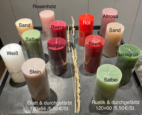 Kerzen sind bei uns bestellbar, ab 5,50 €/St. durchgefärbt rustik oder glatt in 120x60.
