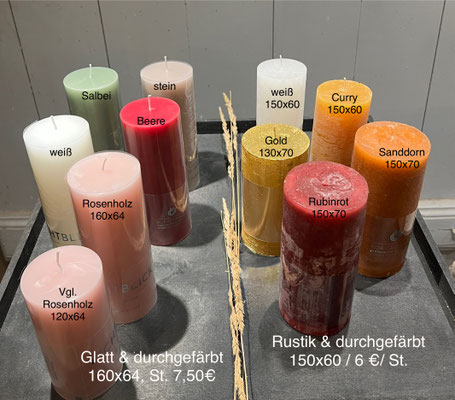 Stumpenkerze: ab 5,50 €/St. durchgefärbt rustik oder glatt.